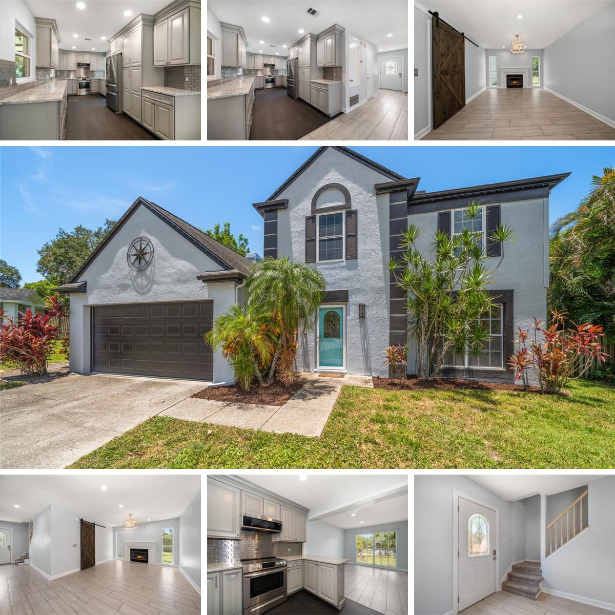 Move right into this beautifully updated Palm Harbor gem, an ideal full-time Florida retreat or excellent income-generating investment. Nestled on a quiet cul-de-sac in a sought-after neighborhood with easy walkability to schools, this home boasts fresh interior and exterior paint and stunning new tile floors that offer a neutral, designer look throughout. The light-filled floor plan features a spacious living room and a gorgeous, newly renovated kitchen with quartz countertops, a subway tile backsplash, stainless steel appliances, and a charming farm sink. Just off the kitchen, a versatile dining or family room is anchored by a cozy wood-burning fireplace and opens to a generous screened lanai - perfect for relaxing Florida evenings and entertaining. The private, fenced backyard adds to the appeal, along with an updated half bath for guests. Upstairs, two bright guest bedrooms offer ample closet space and share a stylish hall bath with tub/shower combo, while the sunny primary suite features a walk-in closet with built-in shelving and an updated ensuite bath with a walk-in shower and sleek vanity with quartz counter top. Additional highlights include recessed lighting, double-pane windows and sliders, plentiful storage, a two-car garage, and a sprinkler system. This is a fantastic opportunity in a sought-after community offering many amenities including a community pool, pickleball and tennis courts, and a playground - don’t miss your chance to call it home!